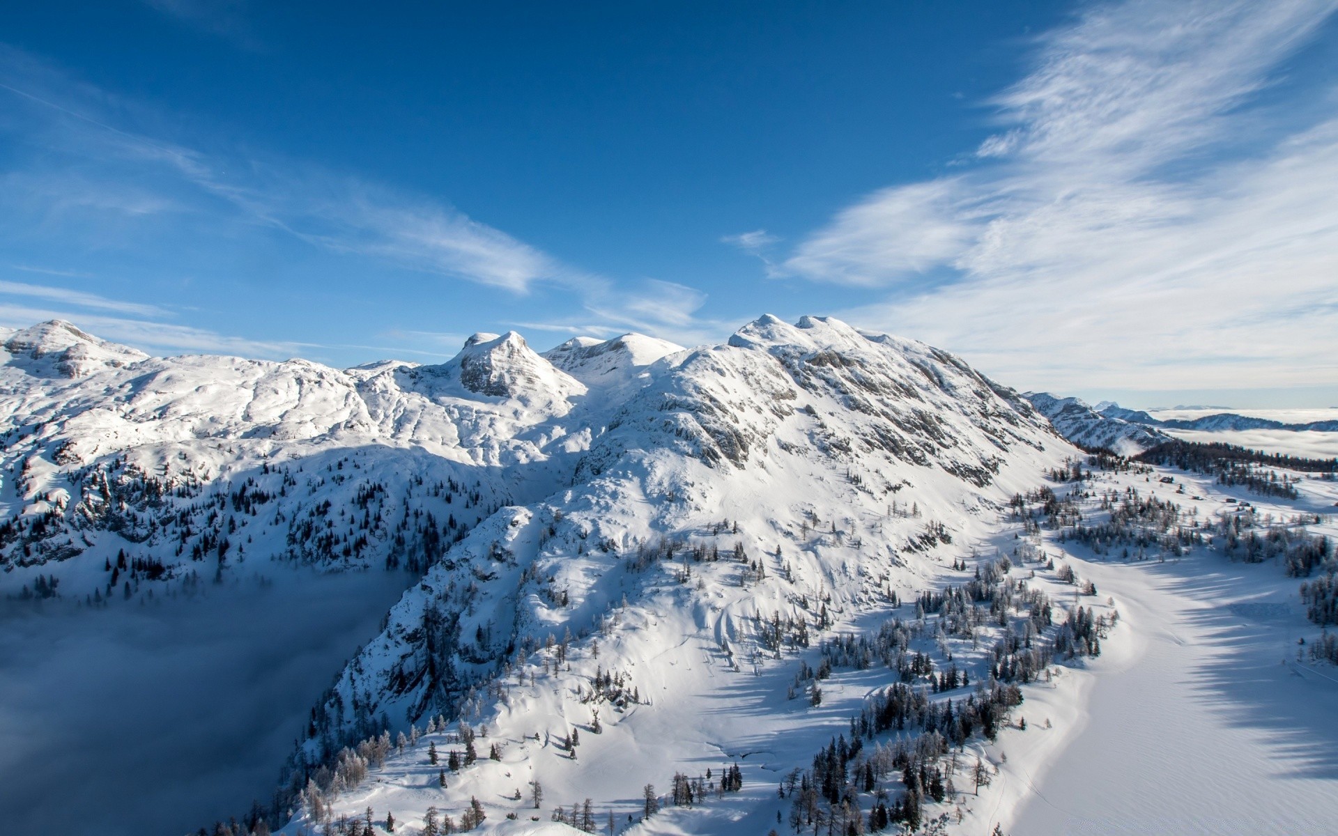 Berggipfel im schnee vor dem hintergrund des blauen himmelsBerggipfel im Schnee vor dem Hintergrund des blauen Himmels