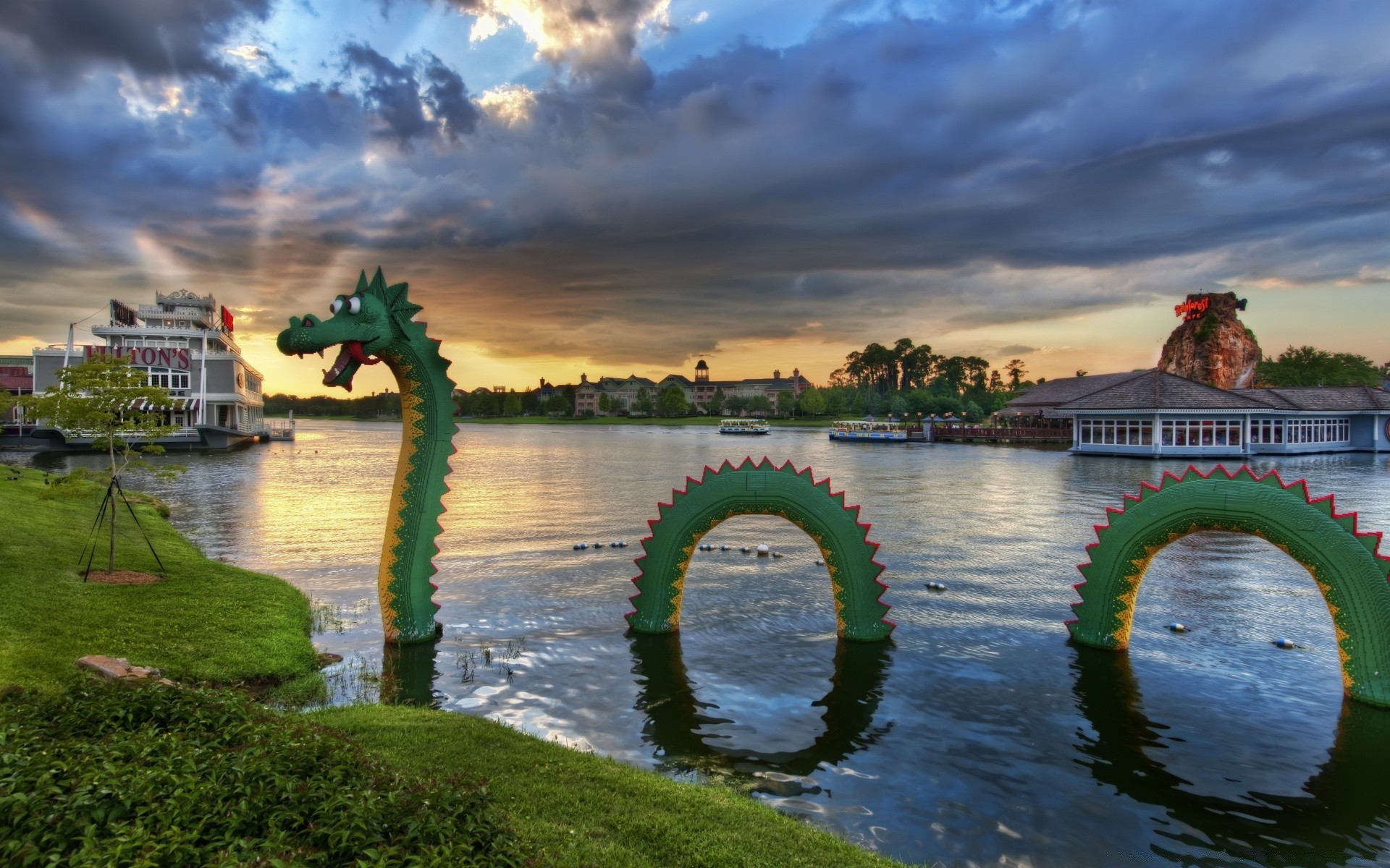 Brücke bei Sonnenuntergang spiegelt sich im Wasser wider