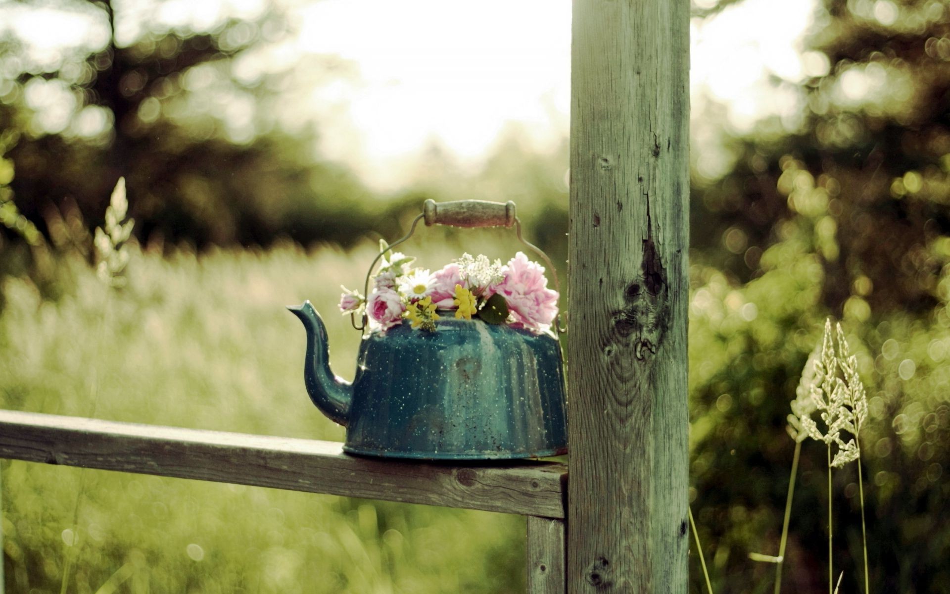 Vintage Teekanne mit Blumen in der Nähe des Zauns
