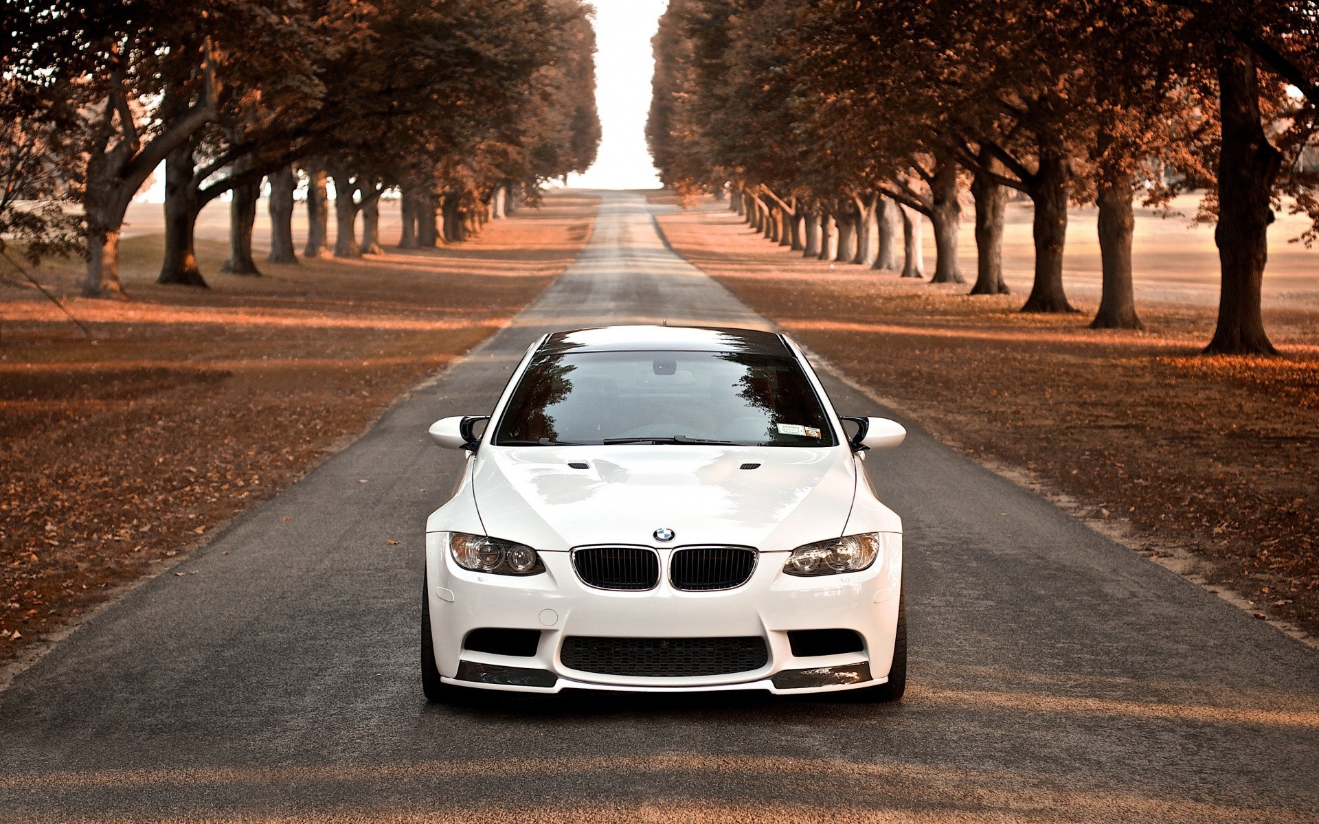 Ein weißer BMW fährt die Straße entlang. An den Seiten der Bäume
