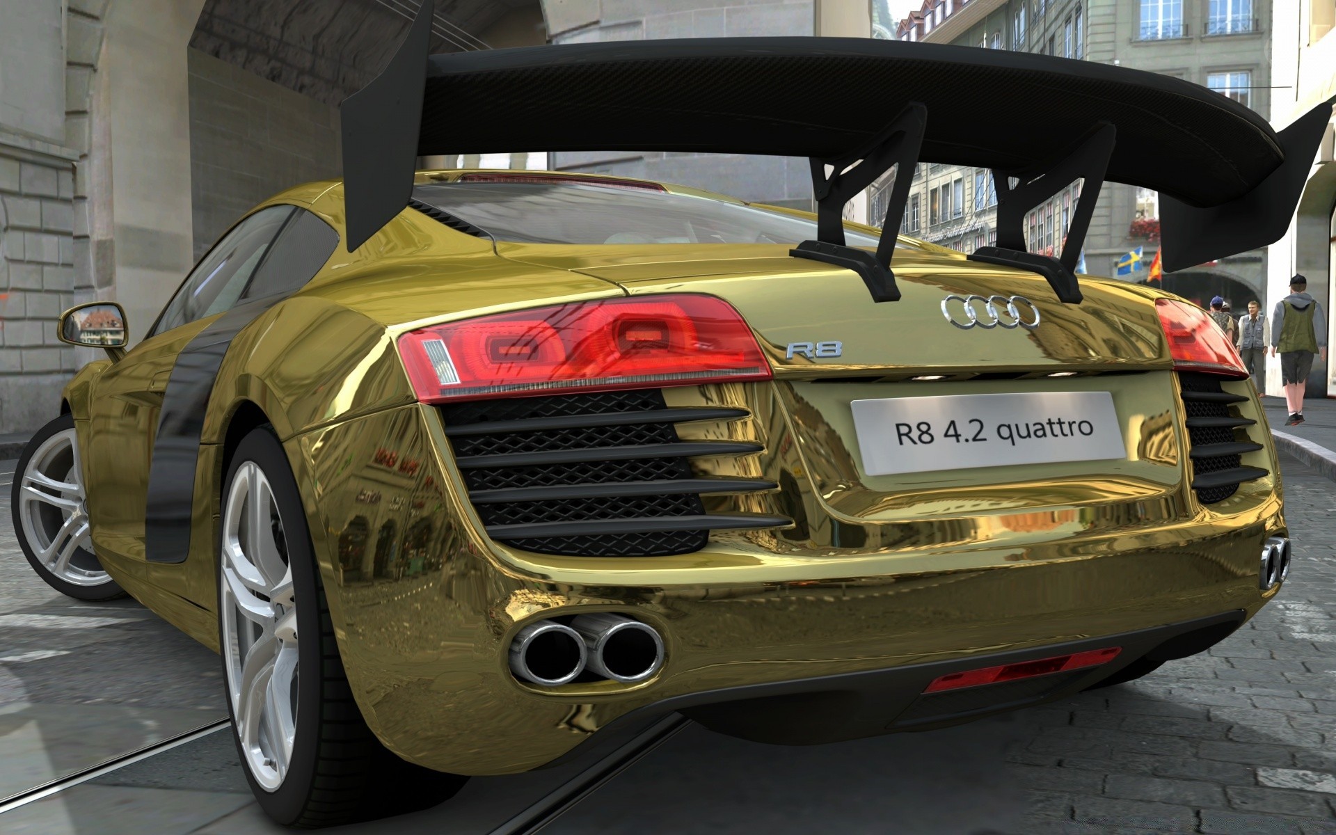 Ein beigefarbener Sportwagen, der auf der nächtlichen Straße fährt