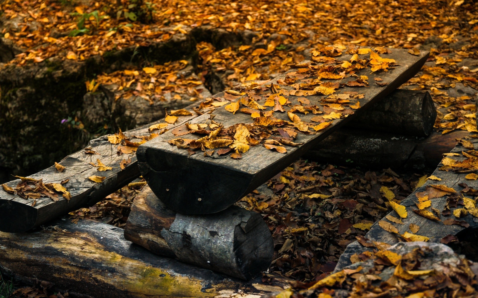 Holzbänke und ein Tisch sind mit Blättern übersät