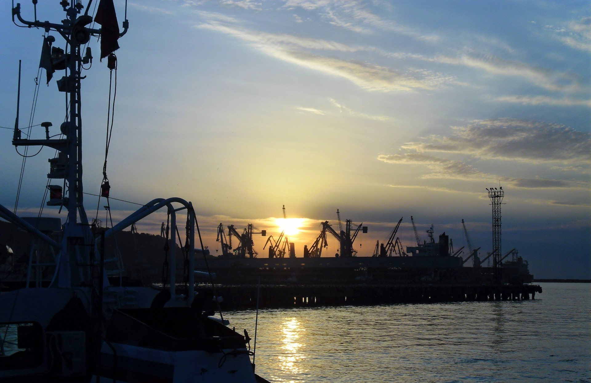 Schwere wasserfahrzeuge vor sonnenuntergang hintergrund