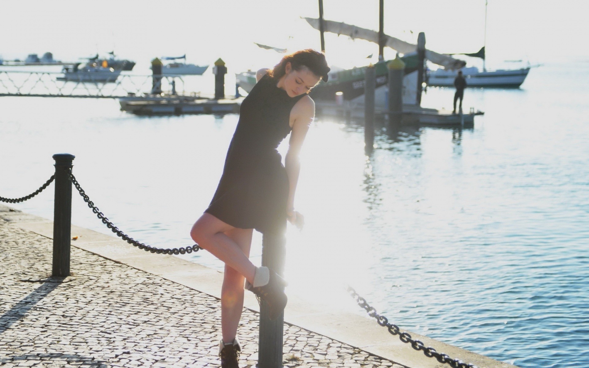 Ein Mädchen in einem kurzen Kleid an der Anlegestelle stützt sich auf einen Metallpfosten