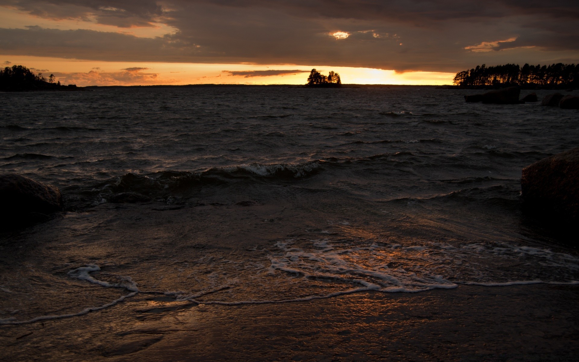 Kleine Wellen und Schaum in der Nähe des Strandes bei Sonnenuntergang