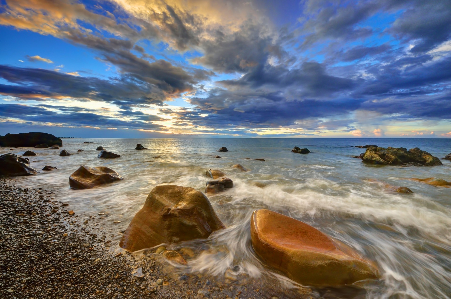 Sonnenuntergang am Meer. Strand am Abend mit Steinen und Wellen