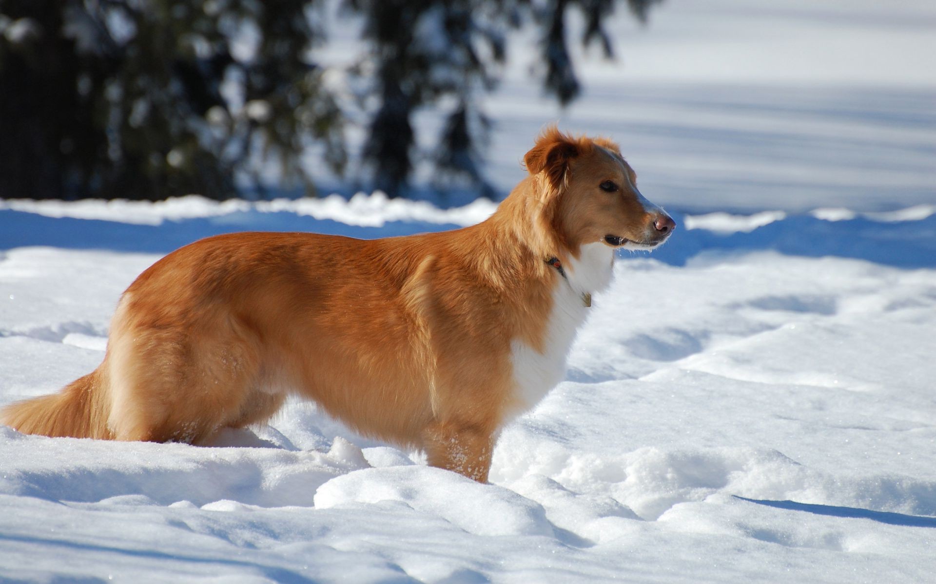 Schneeweißer Hund vor dem Hintergrund des Schnees