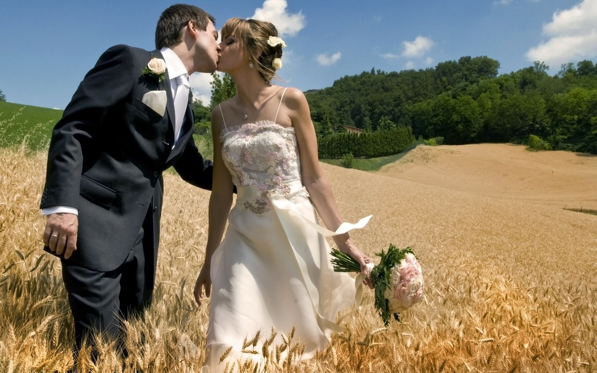 Brautpaare küssen sich mitten auf dem Feld