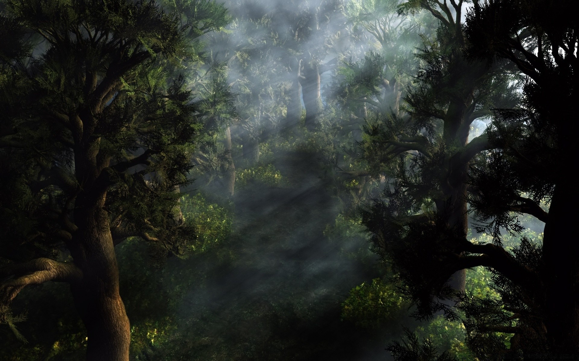 Eine geheimnisvolle Landschaft, Sonnenstrahlen, die sich durch den Wald schleichen