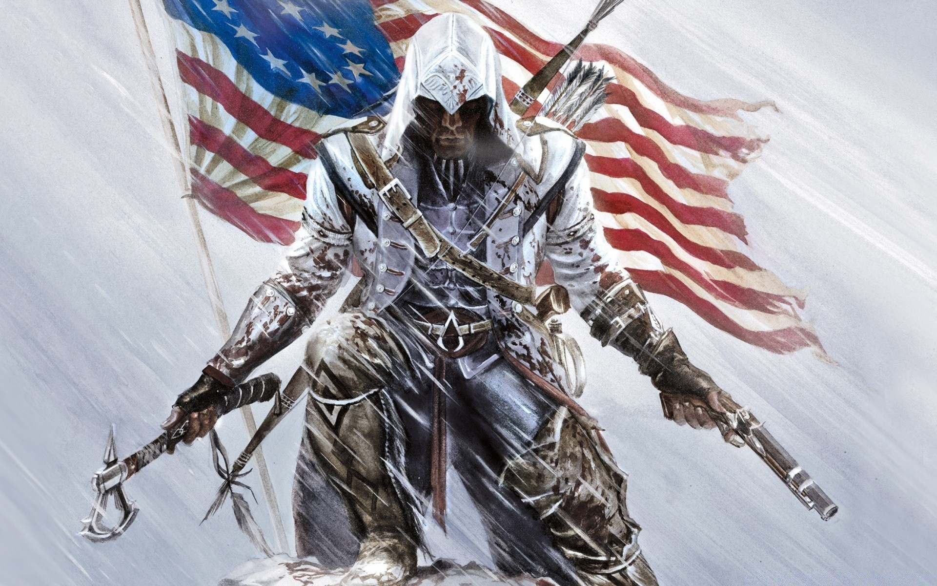 Ein krieger mit einer axt und einem revolver vor dem hintergrund der amerikanischen flagge aus assassin's creedEin Krieger mit einer Axt und einem Revolver vor dem Hintergrund der amerikanischen Flagge aus assassin's creed