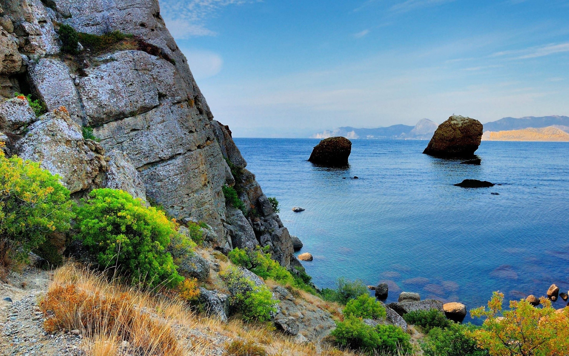 Blauer Ozean bei Sonnenuntergang im Herbst