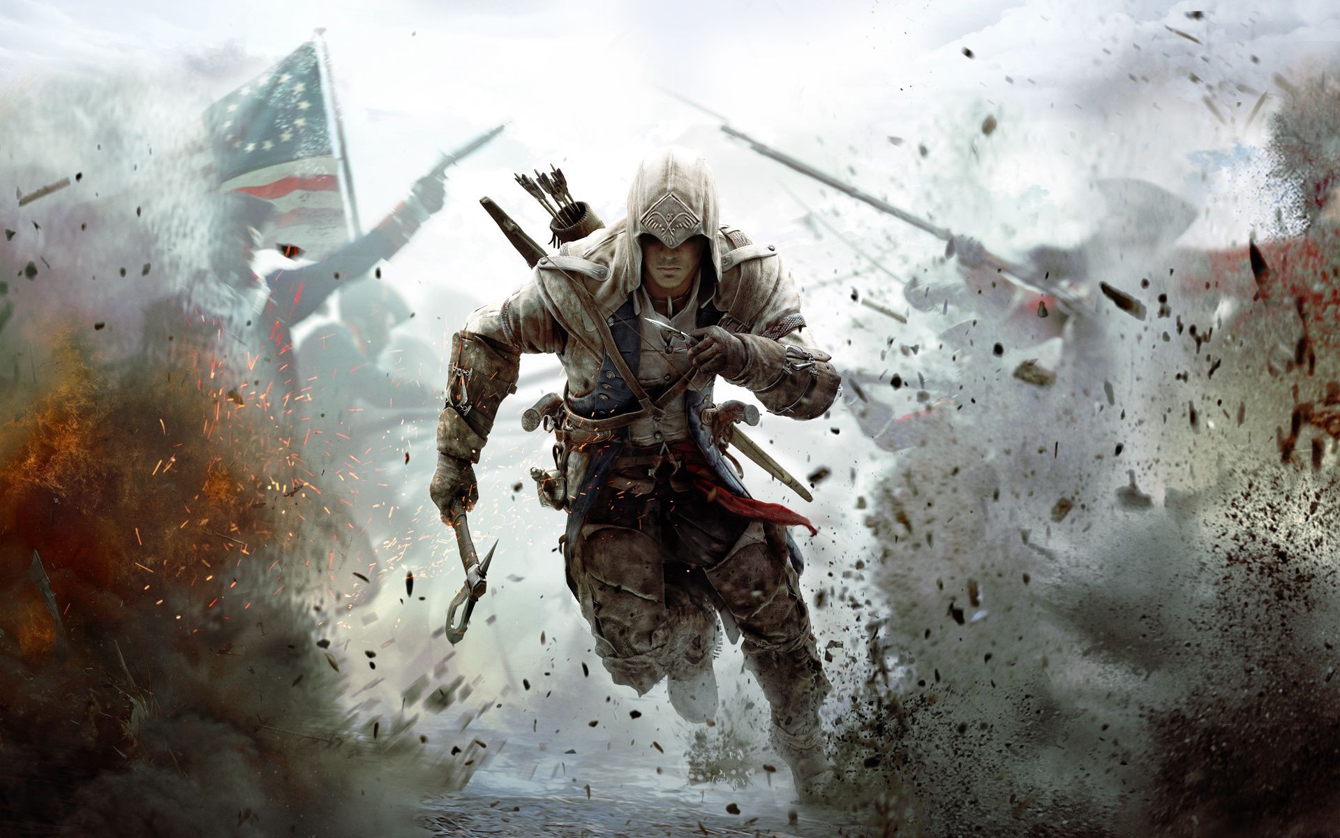 Ein laufender Mann mit einer Waffe auf einem Hintergrund von Kriegern