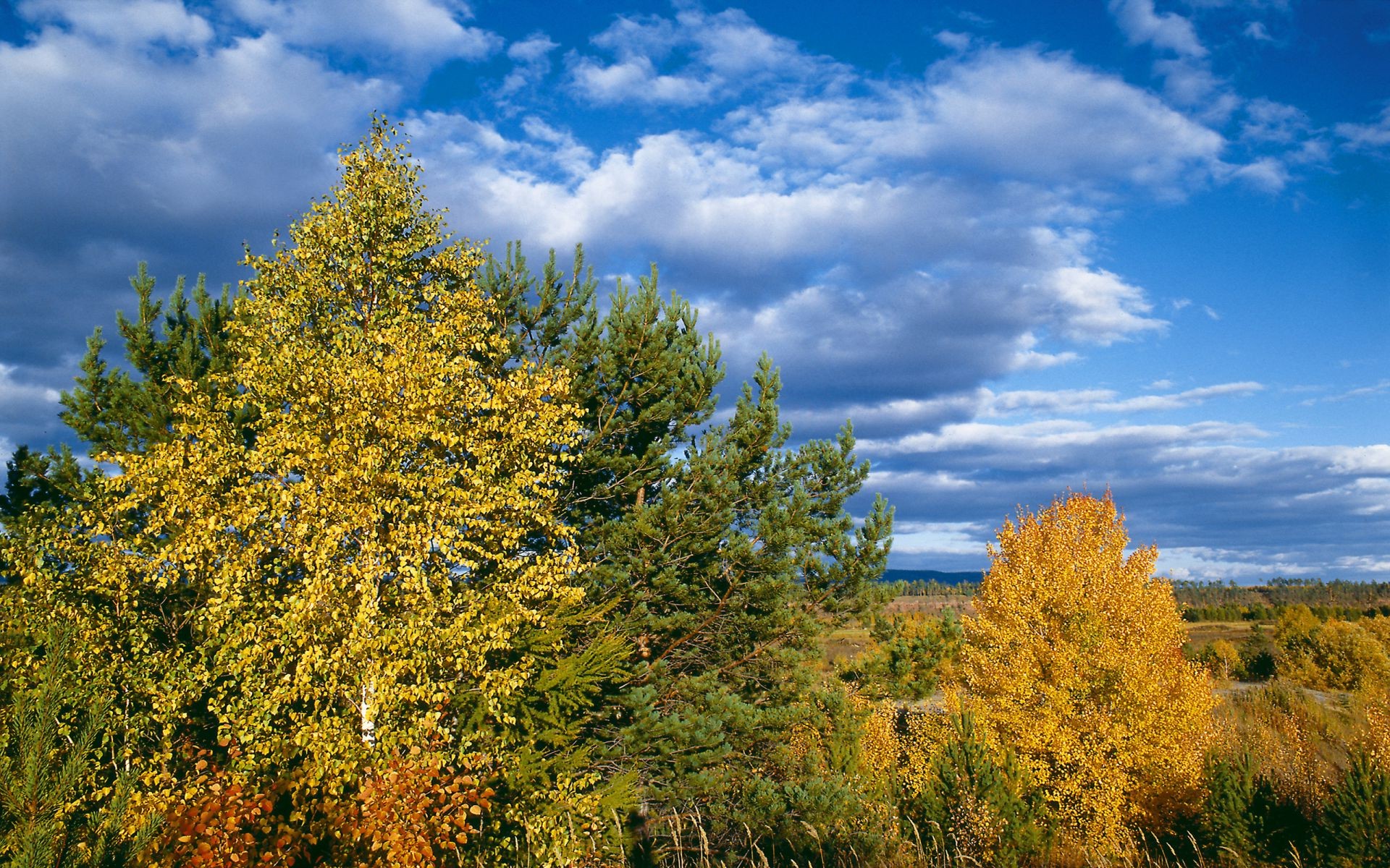 Eine Vielzahl von Herbsttönen. Bäume auf einem schönen Himmelshintergrund mit Wolken