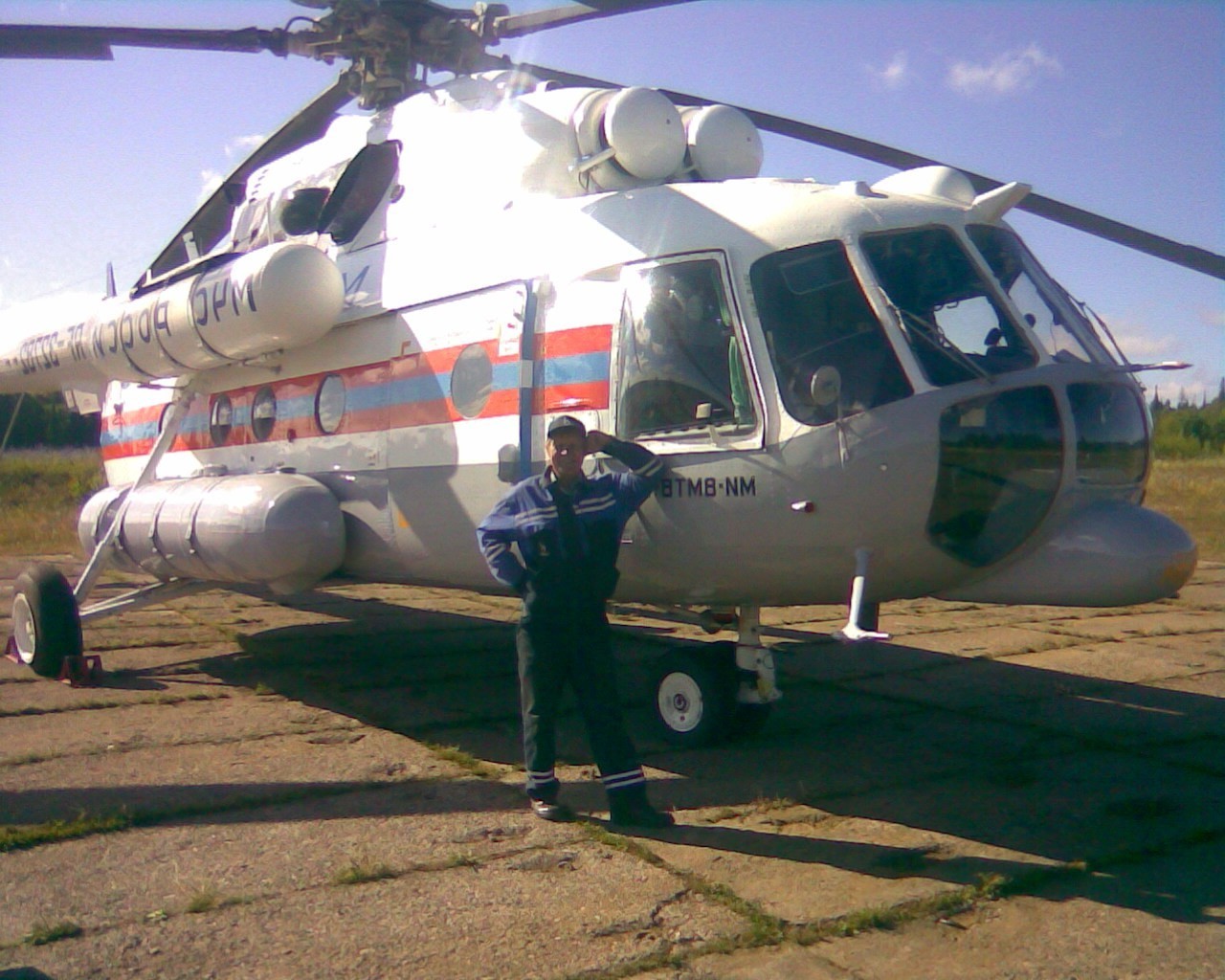 Mann in der Nähe des Rettungshubschraubers auf dem Flugplatz