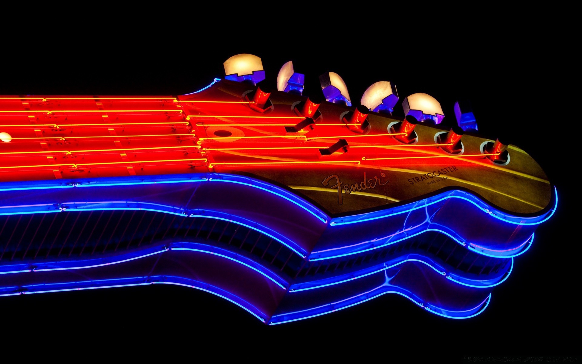 Der Musiker hält eine Gitarre. Mit langen Haaren ele