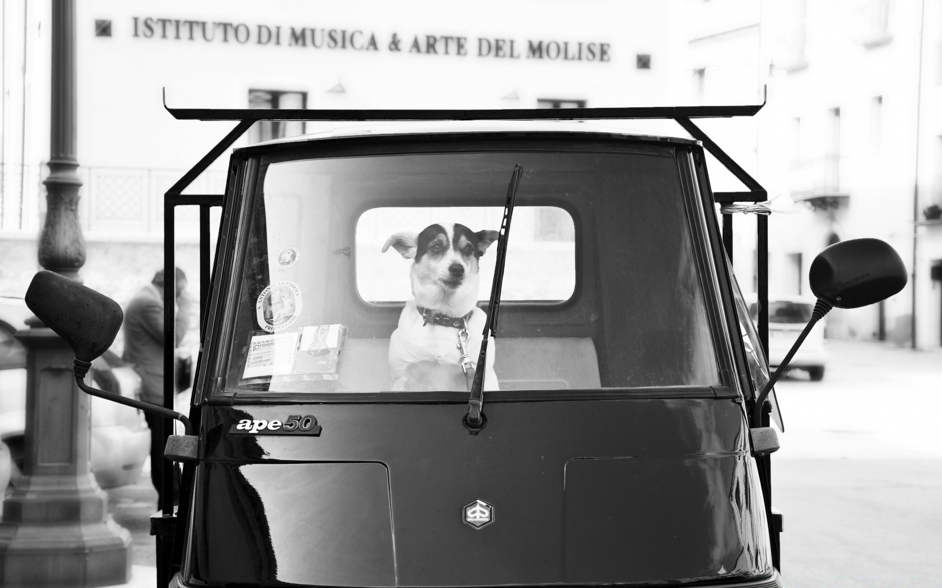 Altes Foto eines Autos mit einem Hund