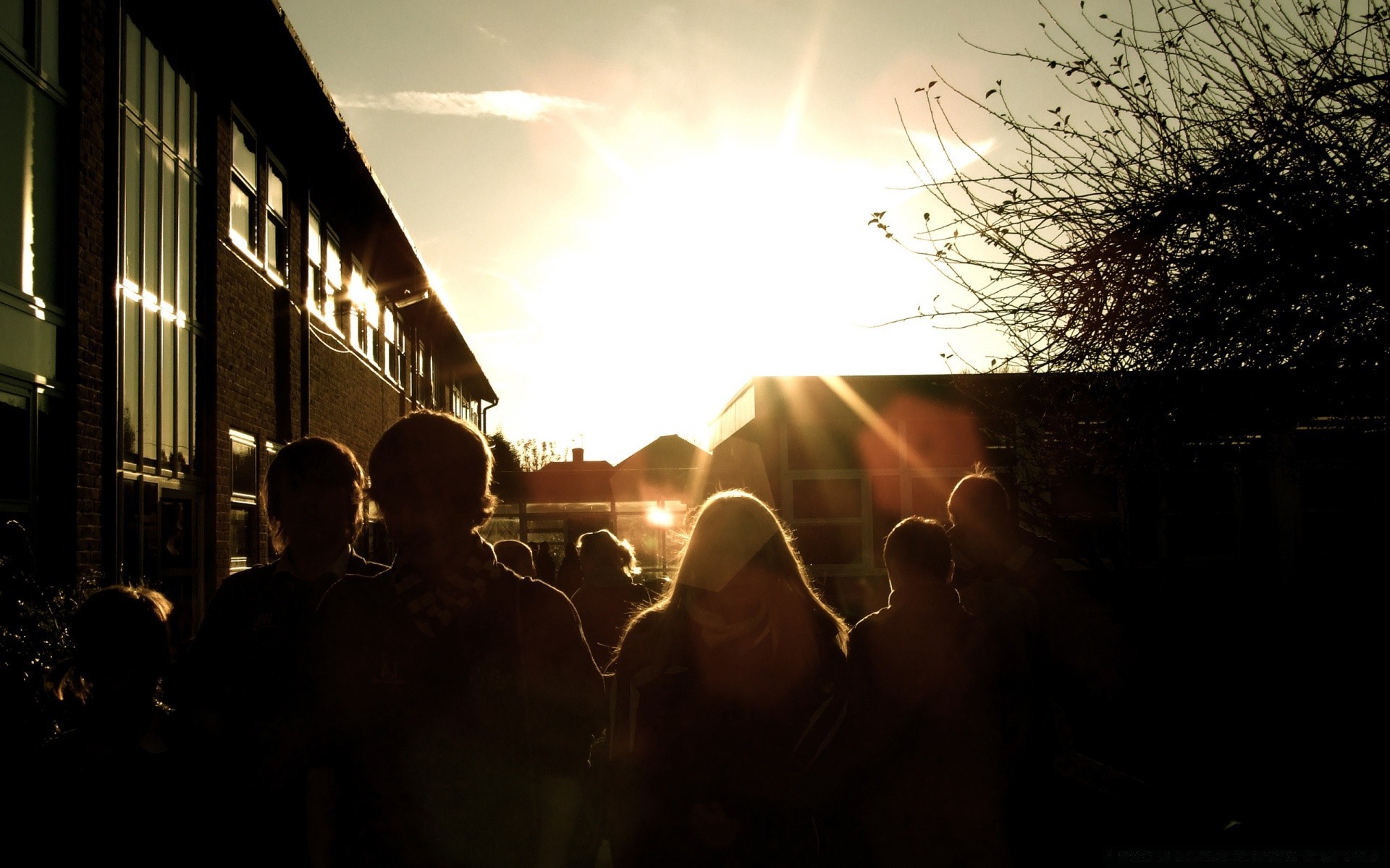 Dunkle Silhouetten von Menschen auf dem Hintergrund der Sonne
