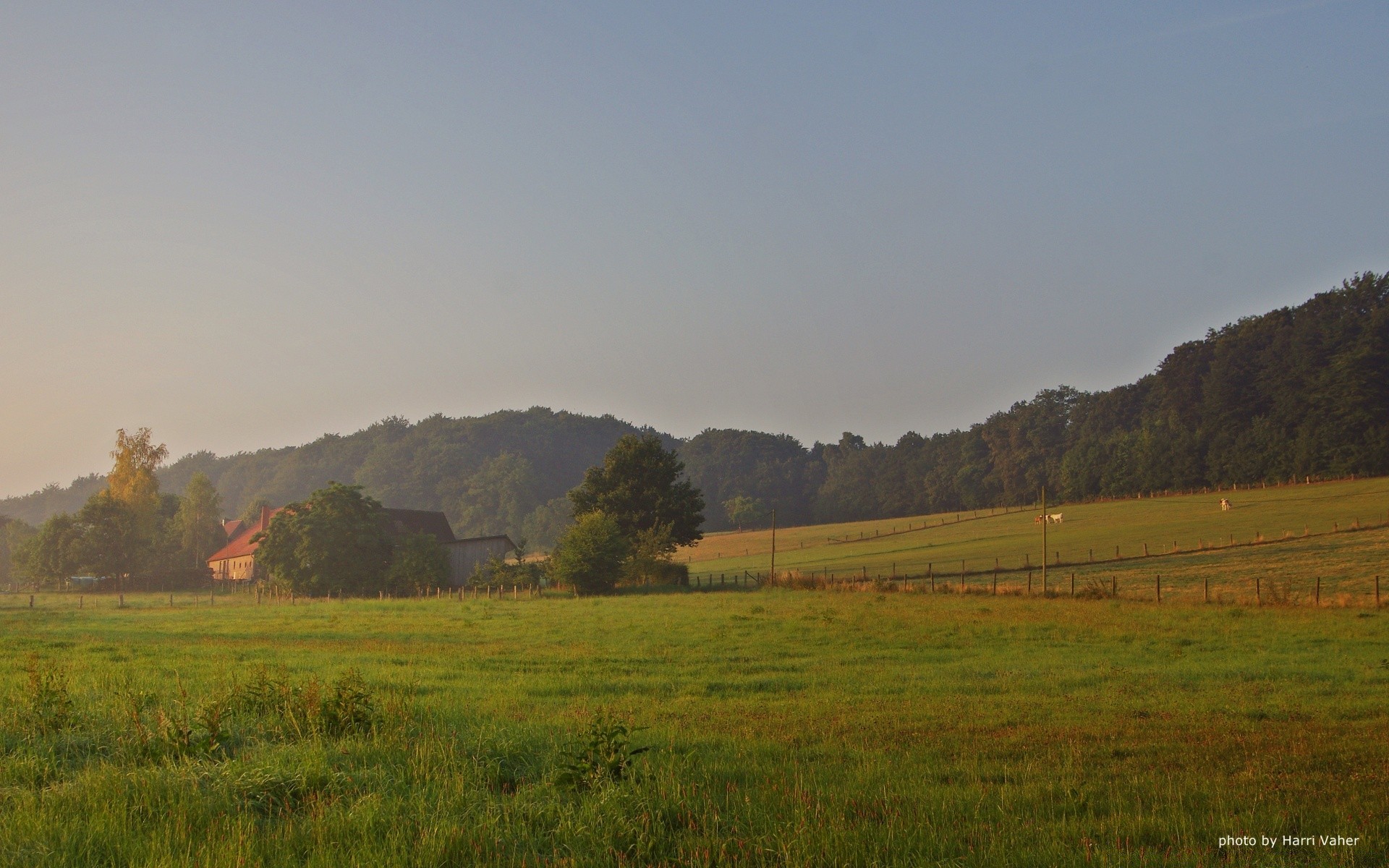 Ein Dorfhaus im Grün der Bäume im Morgengrauen