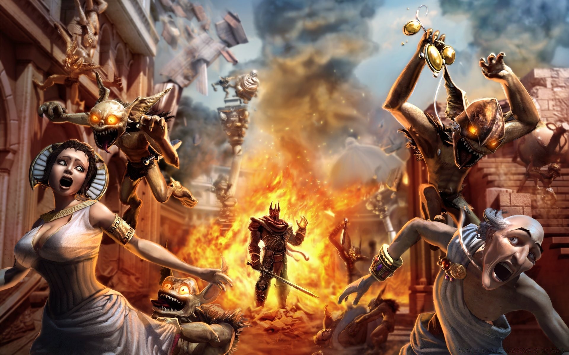 Ein Krieger steht in Flammen und die Menschen, die vor ihm fliehen