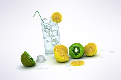 Wasser mit Zitrone und Eis in einem hohen Glas