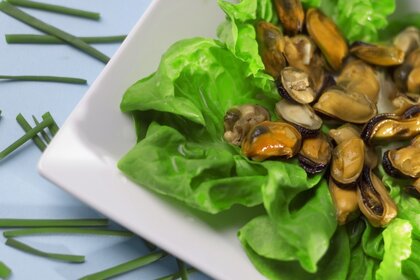 Muscheln auf Tellern mit grünem Salat
