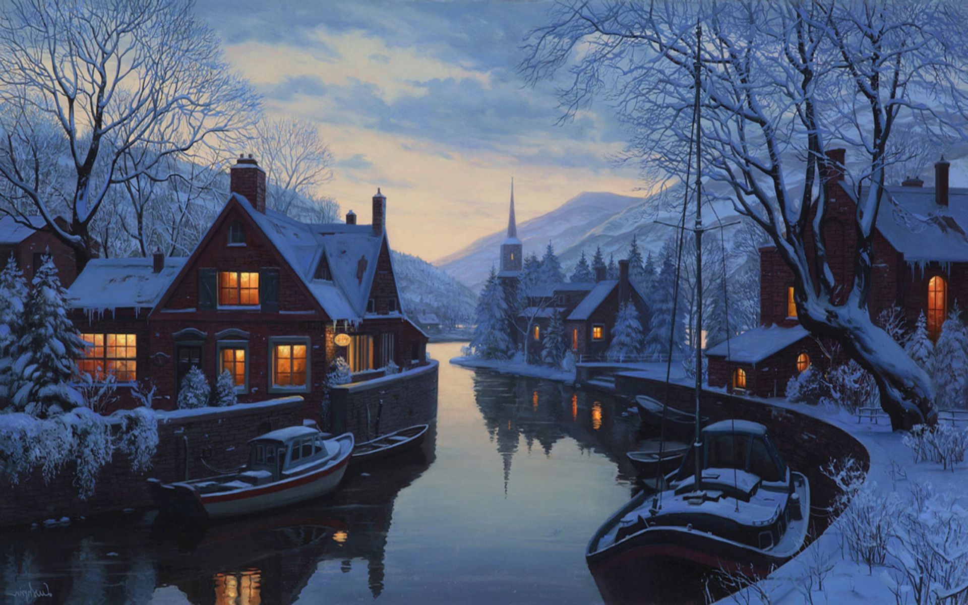 Schnee. Winter. Haeuschen. Der Fluss. Die Schönheit