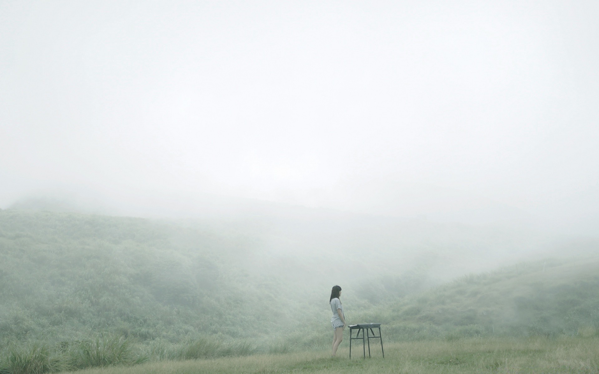 Mädchen im Nebel auf einem Berg im Sommer
