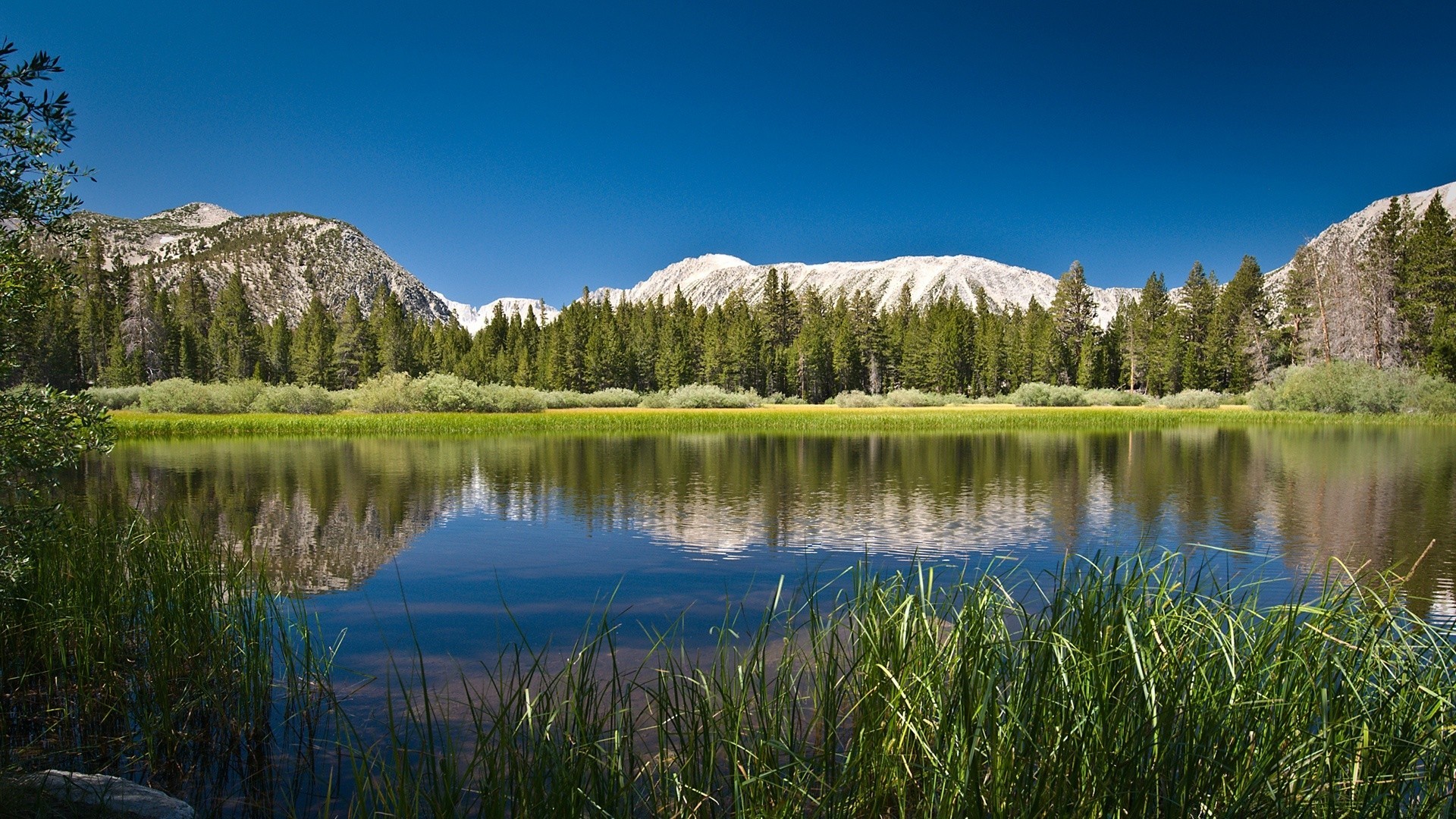 Blick auf die Berge und den Wald über den Fluss mit Reflexion