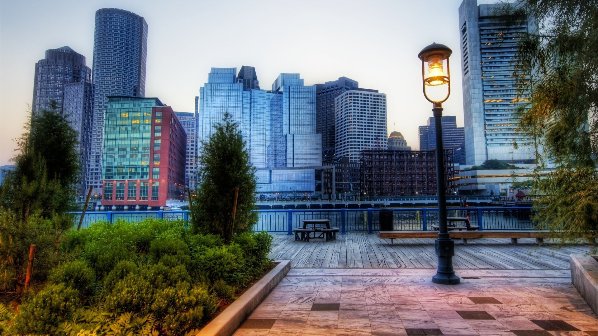 Gogod mit Wolkenkratzern Laterne und Bäume