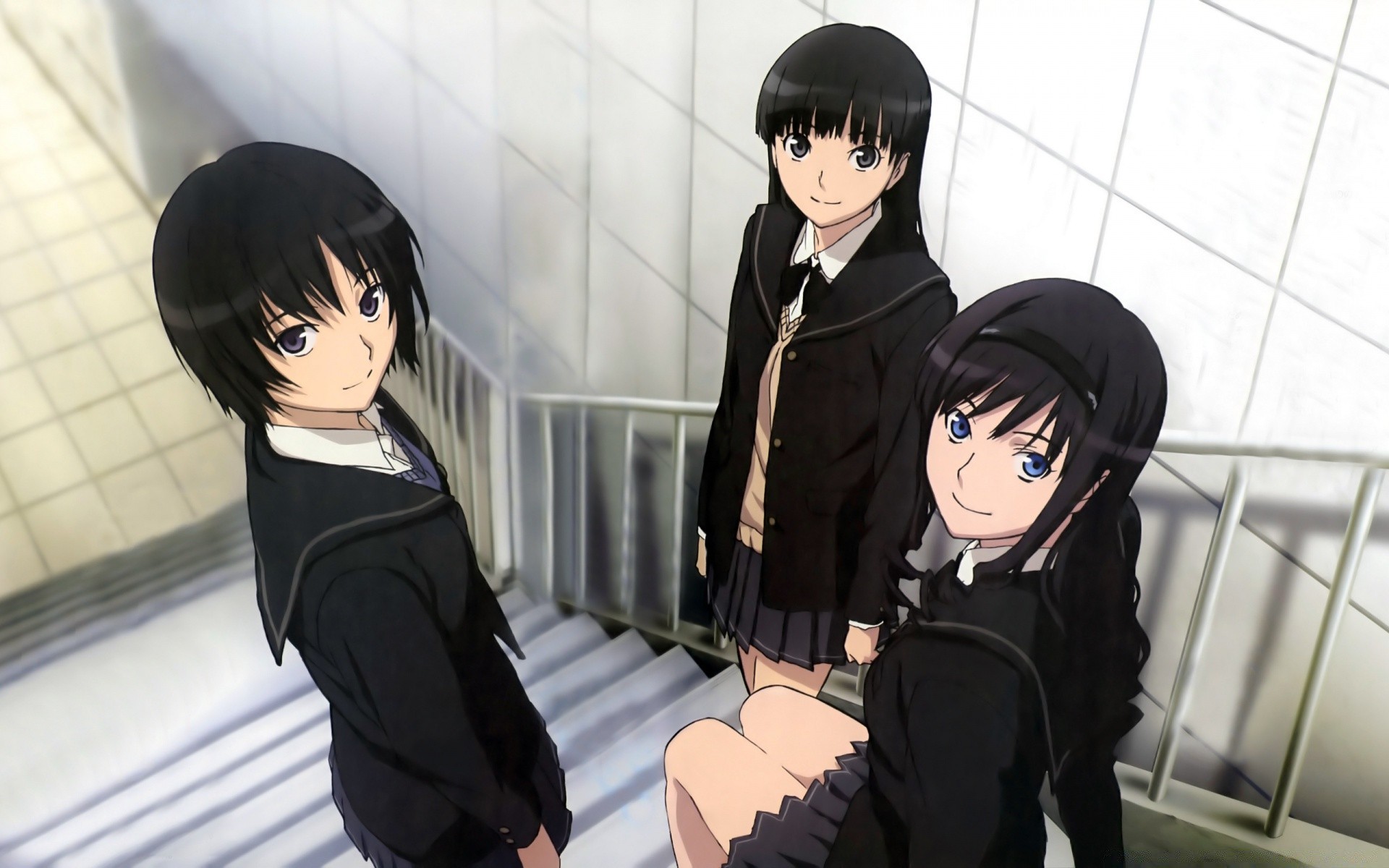 Drei kleine anime schulmädchen mädchen laufen auf dem wegDrei kleine anime Schulmädchen Mädchen laufen auf dem Weg