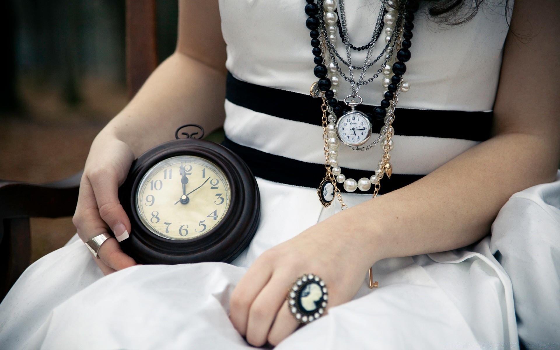 Erwachsene Frau im weißen Kleid mit einer Uhr auf Ihren Knien