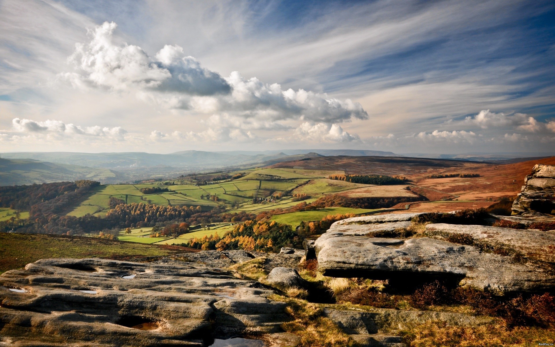 Ländliche Feldlandschaft auf bewölktem Himmel Hintergrund
