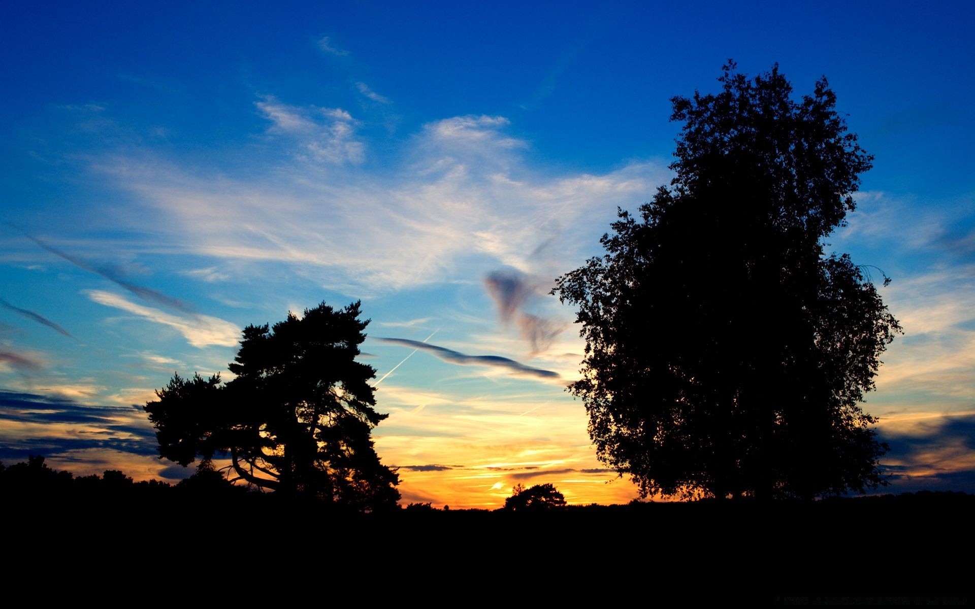 Der bunte Himmel auf dem Hintergrund der Bäume