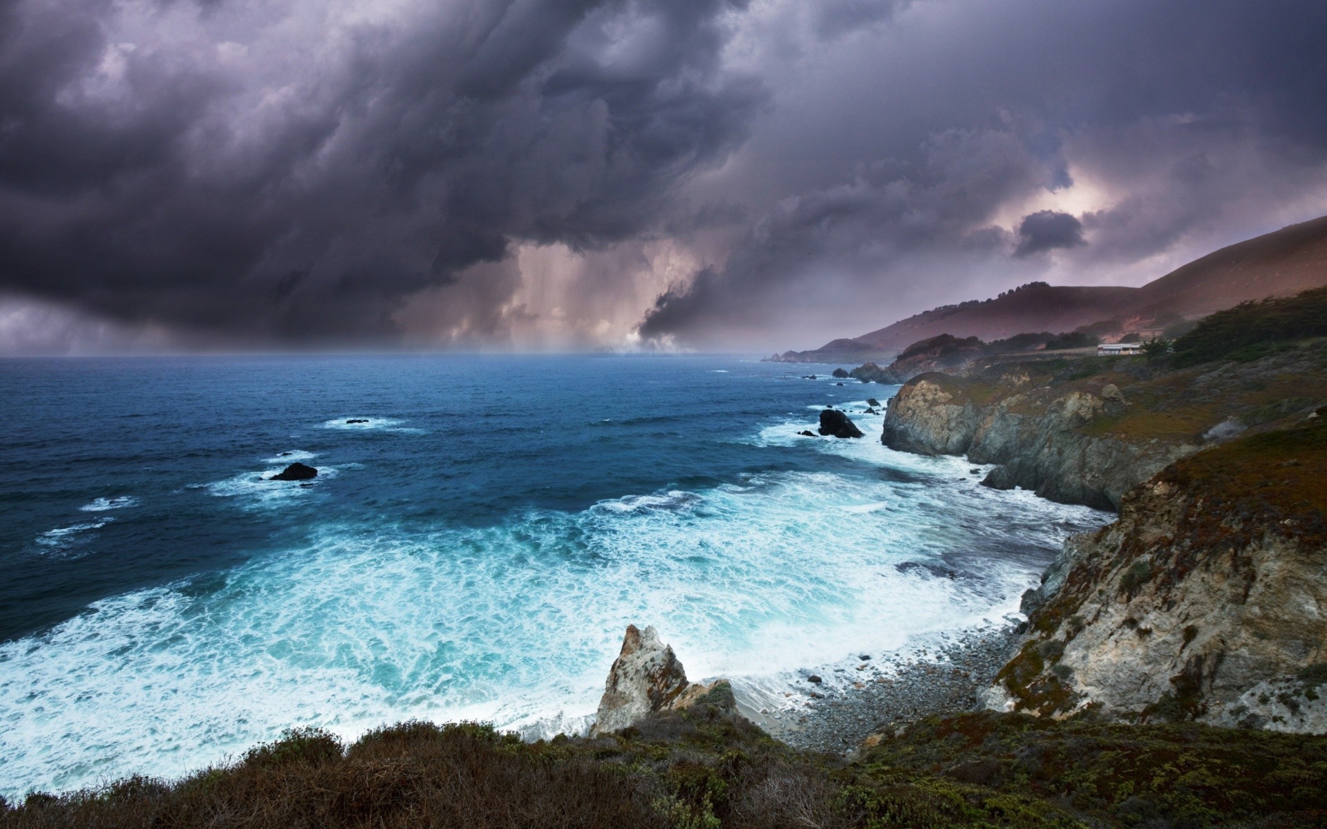 Meerwasser tobt an felsigen küsten unter bewölktem himmelMeerwasser tobt an felsigen Küsten unter bewölktem Himmel