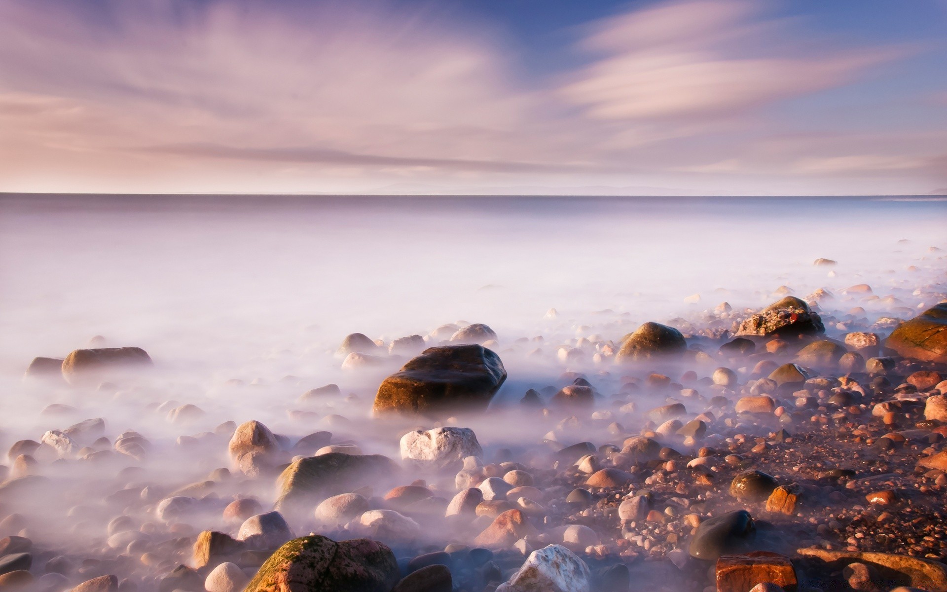Ein Teich zwischen den grünen Felsen, die in Dunst gehüllt sind