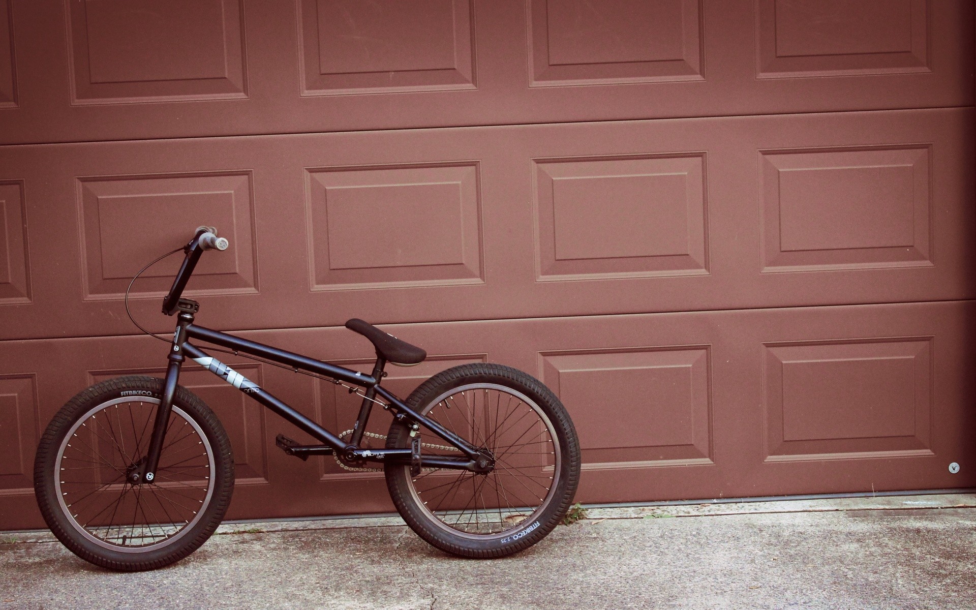 Ein fahrrad neben einem garagentor, das wie eine schokoladenfliese aussiehtEin Fahrrad neben einem Garagentor, das wie eine Schokoladenfliese aussieht