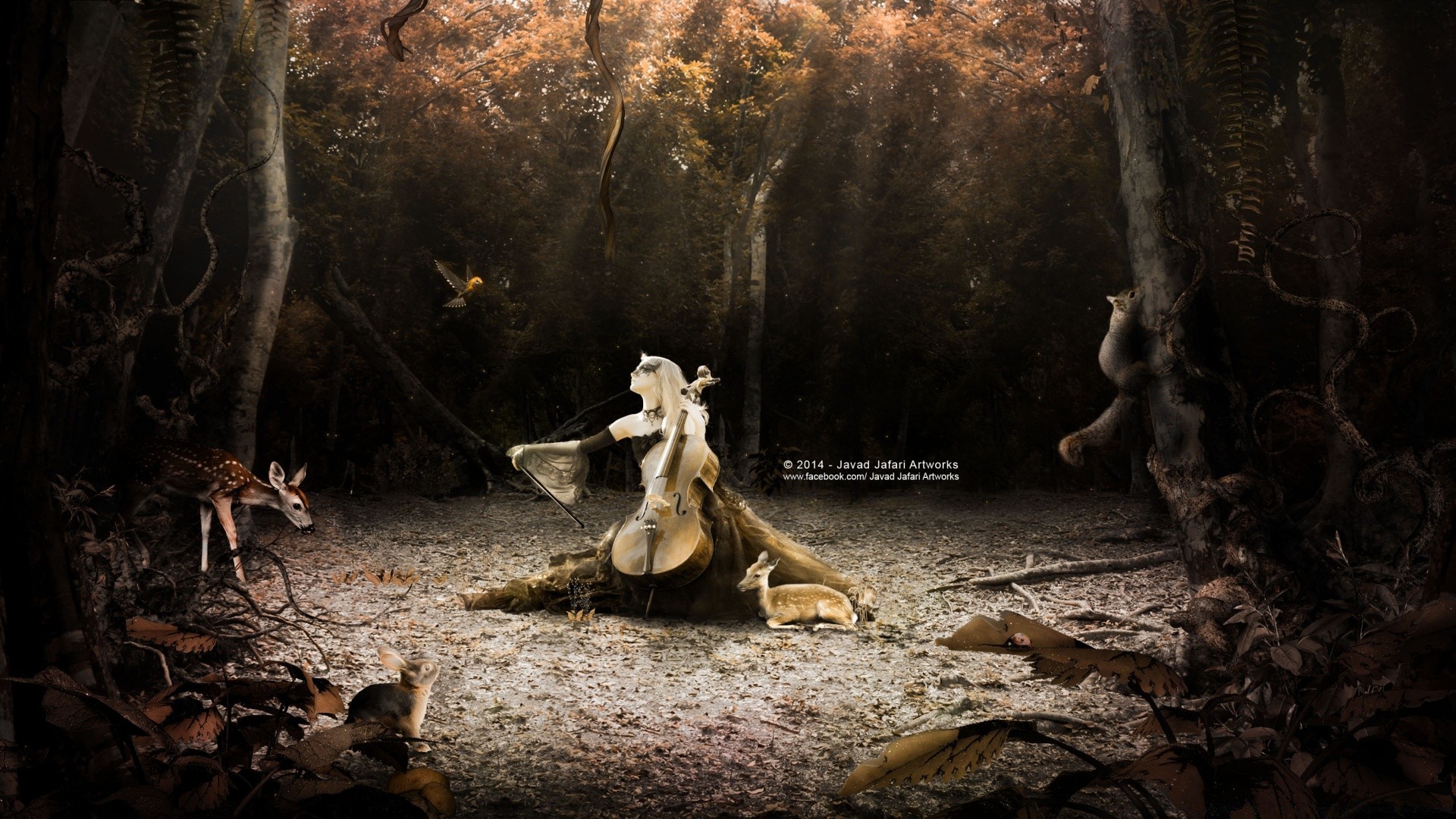 Das mädchen sitzt im wald und spielt ein musikinstrument für tiereDas Mädchen sitzt im Wald und spielt ein Musikinstrument für Tiere