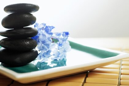 Eine leiter im kreis von büschen mit blauen blütenEine Leiter im Kreis von Büschen mit blauen Blüten