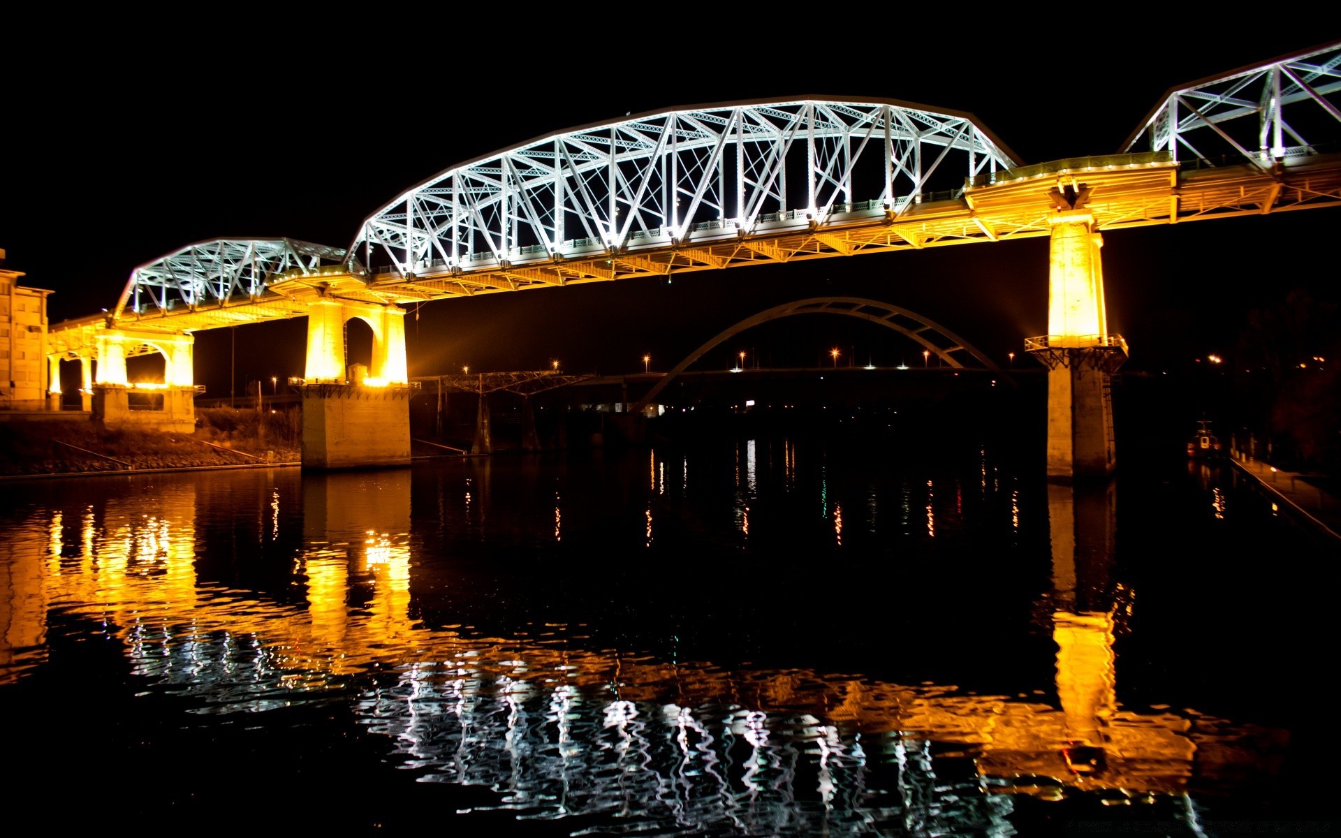 Eine graue stadt und eine riesige brücke über den flussEine graue Stadt und eine riesige Brücke über den Fluss