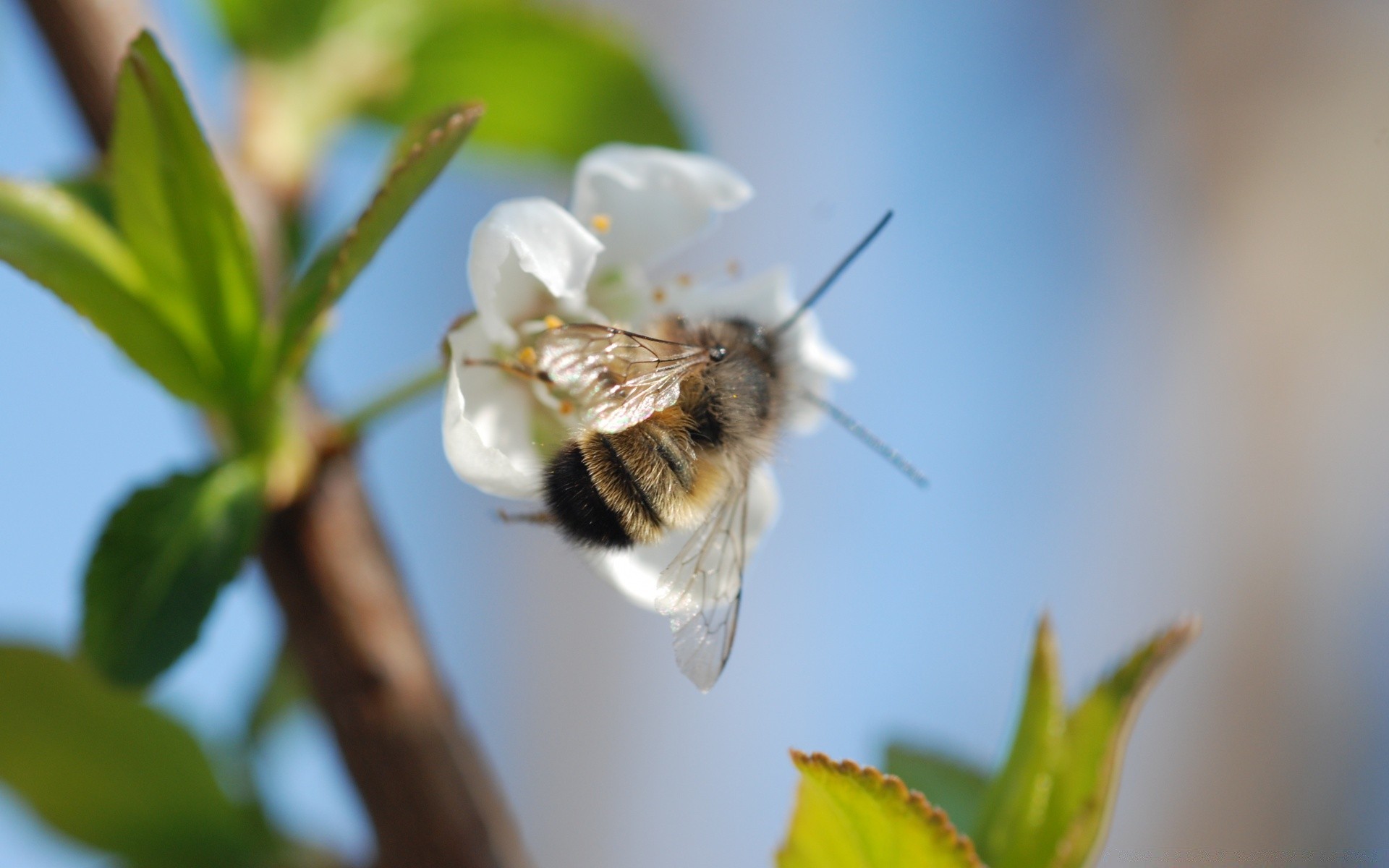 Eine Biene setzte sich unter den Strahlen der Sonne auf eine Blume