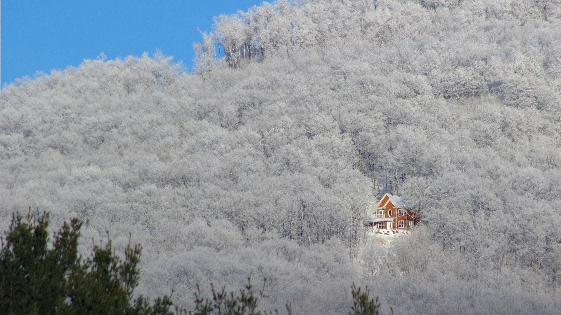 Ein einsames warmes und gemütliches Haus im Winterwald