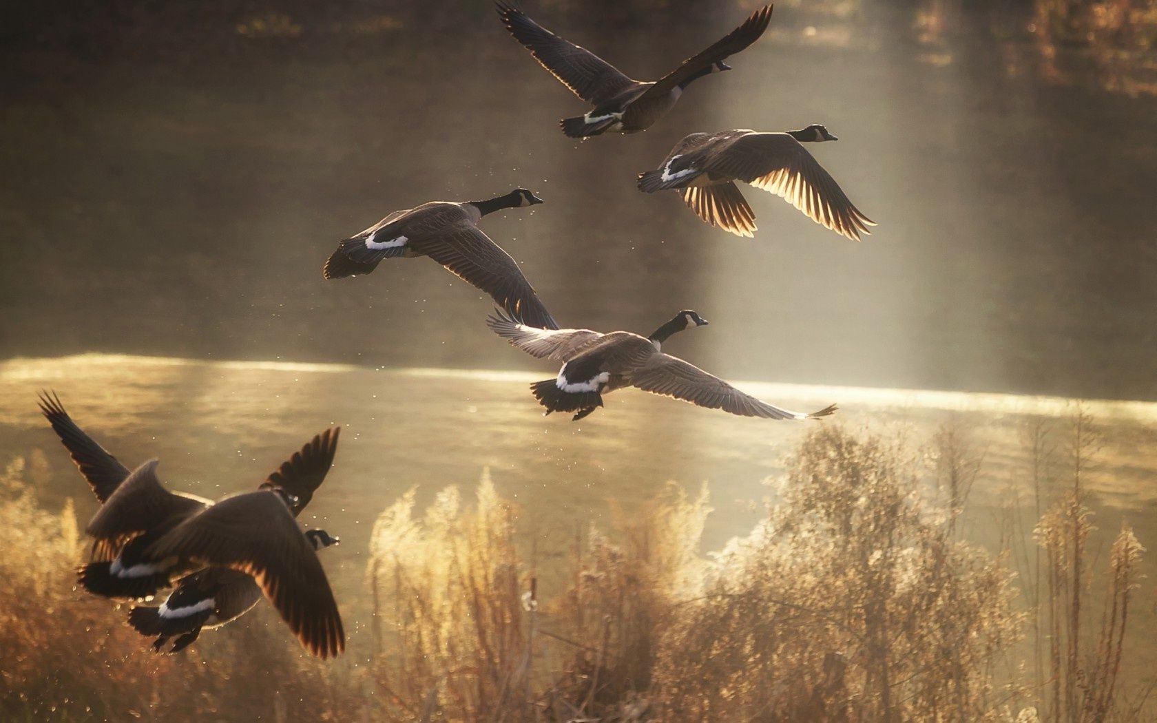 Enten schwimmen auf dem See, und ein Jäger folgt ihnen