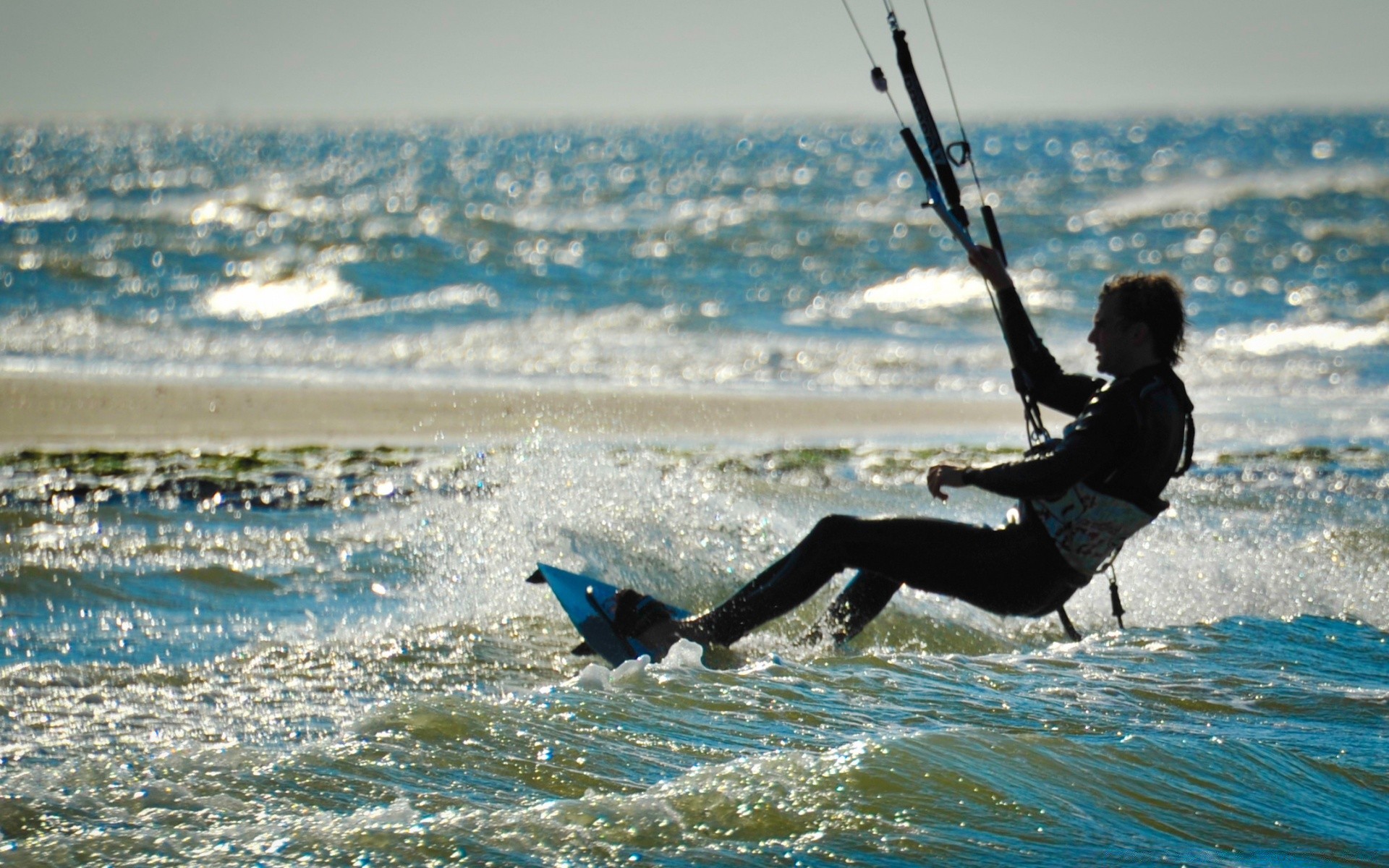 Surfer auf den Wellen bei abendlichem Sonnenuntergang