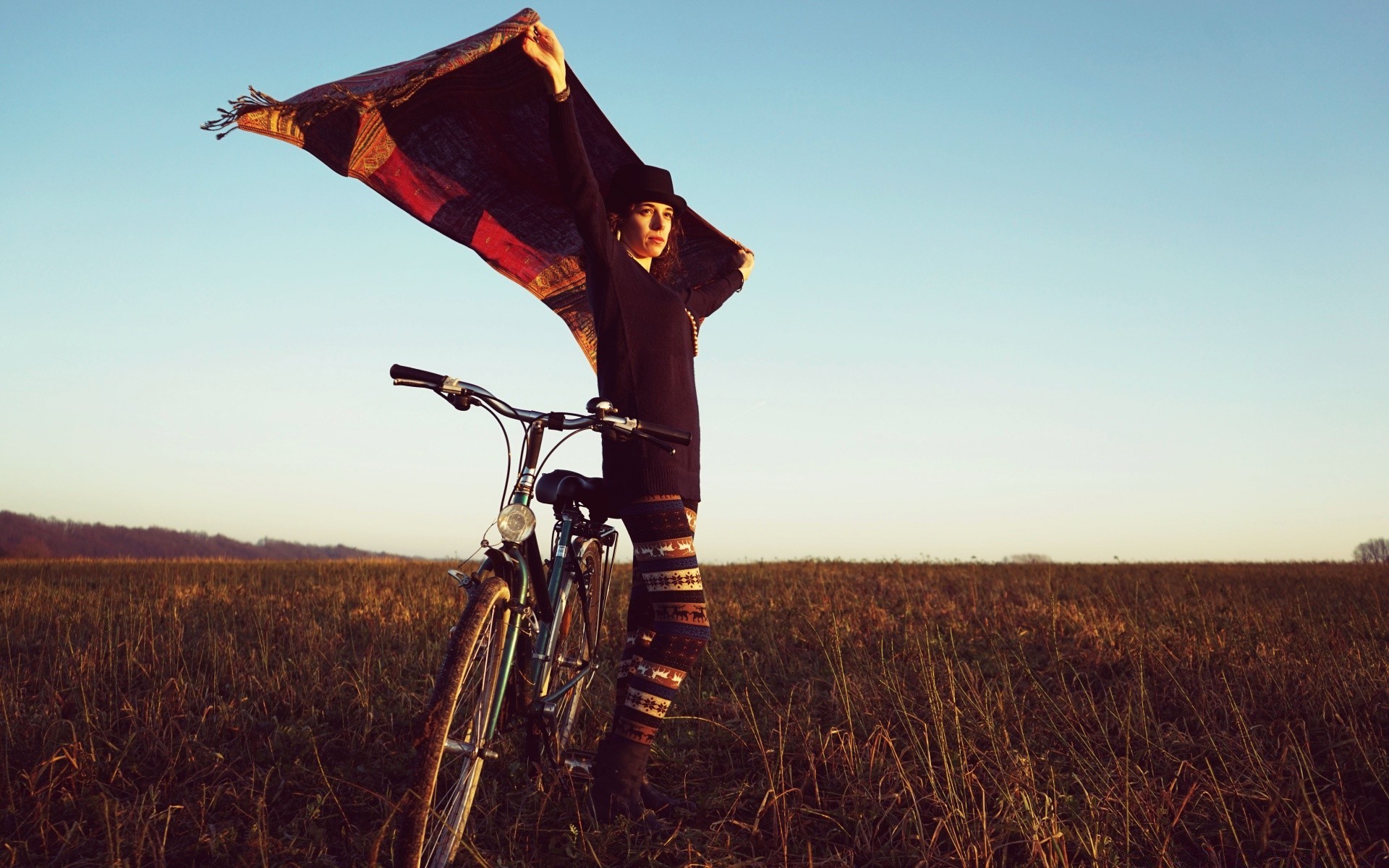 Mädchen mit Fahrrad hält ein Taschentuch im Wind über dem Kopf