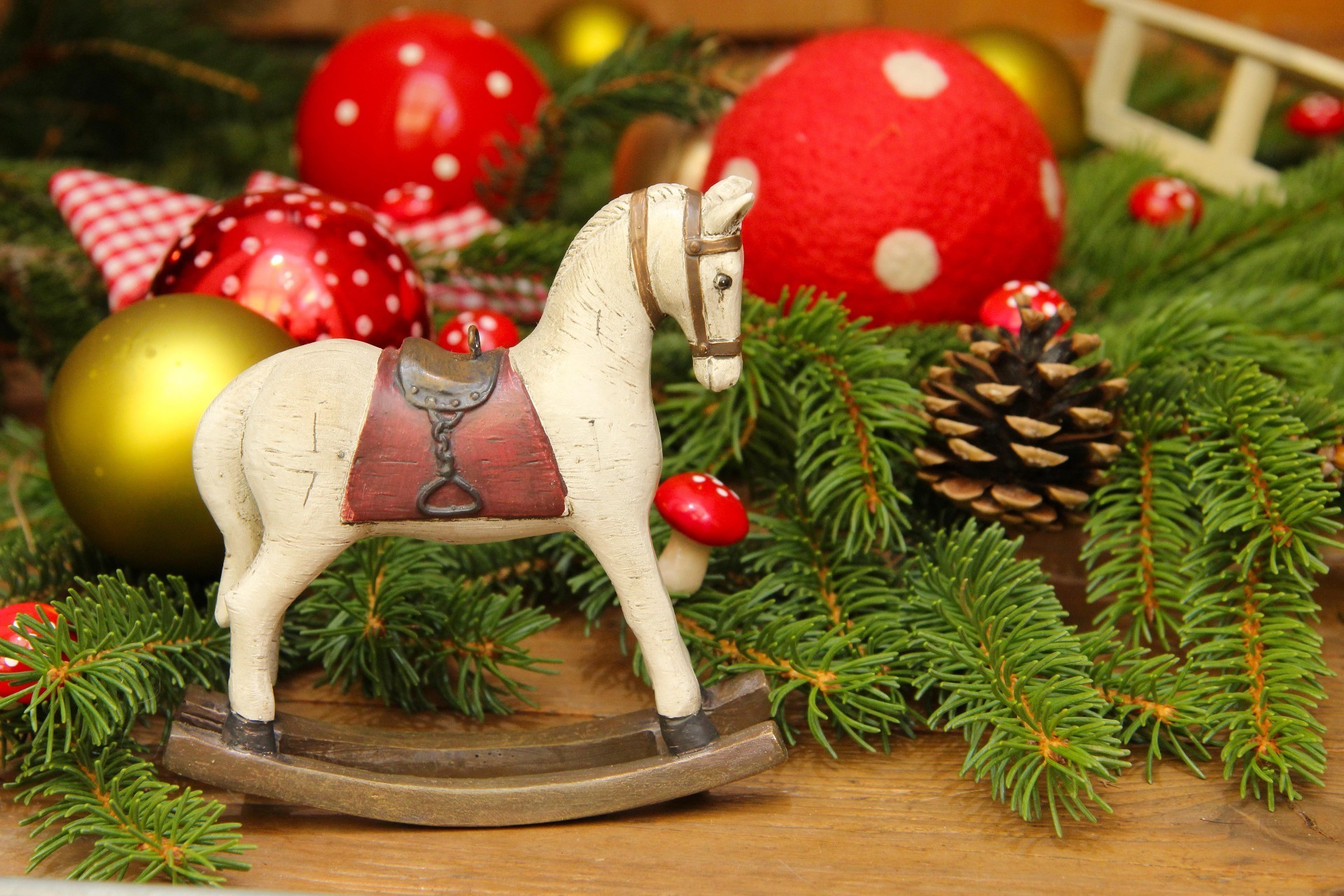 Holzpferd auf dem hintergrund des weihnachtsspielzeugsHolzpferd auf dem Hintergrund des Weihnachtsspielzeugs