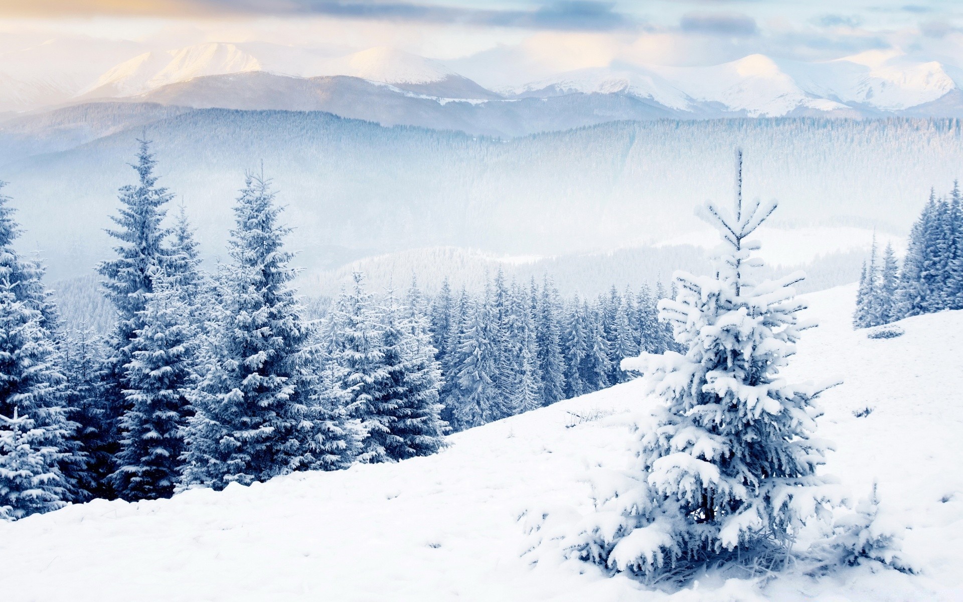 Verschneite jahrhundertealte Fichten vor dem Hintergrund der Berge
