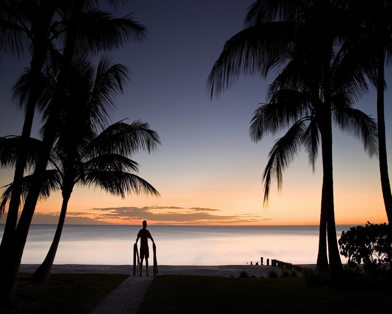 Tropischer Strand erleuchtet den Sonnenuntergang