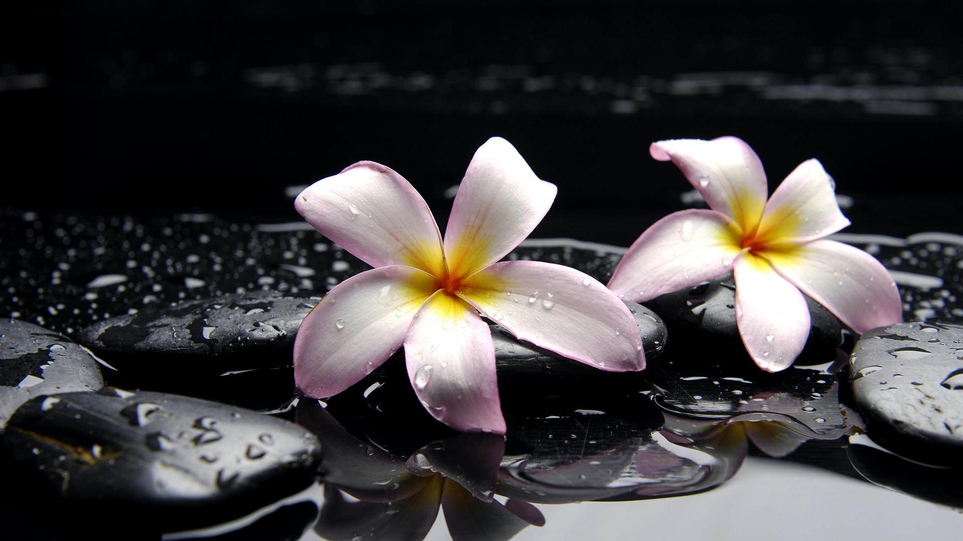 Bild von zwei zarten, lebendigen Blumen auf nasser Oberfläche