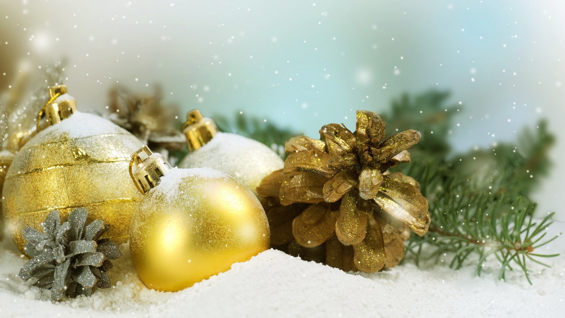 Weihnachtskugeln und Tannenzapfen im Schnee