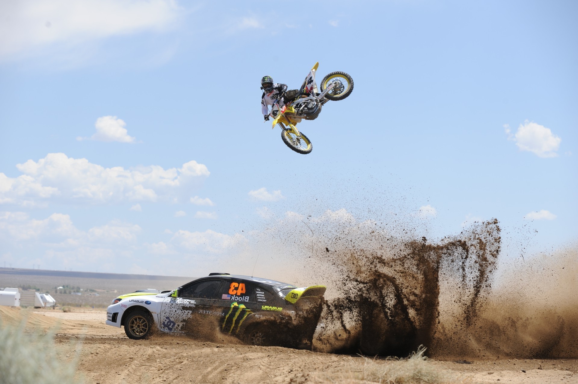 Erstaunlicher Motorradsprung auf einem Rallye-Auto